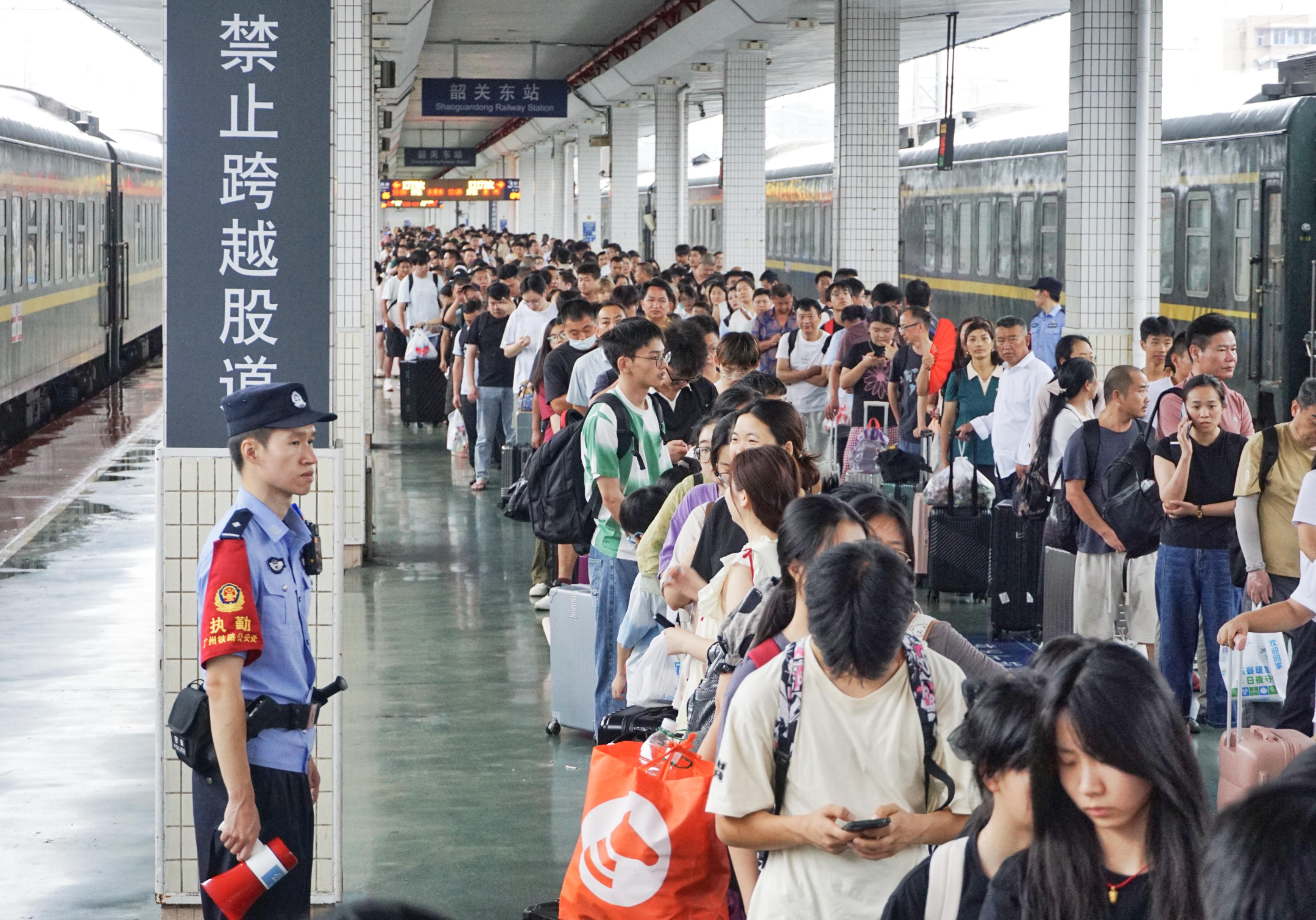 “K921、K1171、K775等三趟南下列车将停运,3500余人滞留韶关东站,妥善做好转运工作。”8月5日上午10时30分许,韶关东站派出所迅速启动应急响应机制,联合铁路工务部门对线路防洪重点区段进行全力盯控,确保对自然灾害的发生能及时预警,同时对线路、站内停摆列车做到全程监护,配合列车工作人员安抚旅客焦急情绪,协调解决列车上饮食困难。此外,他们联合铁路部门对候车室内滞留旅客进行安抚疏导,确保旅客理解列车停运后退票秩序和安全离开车站。