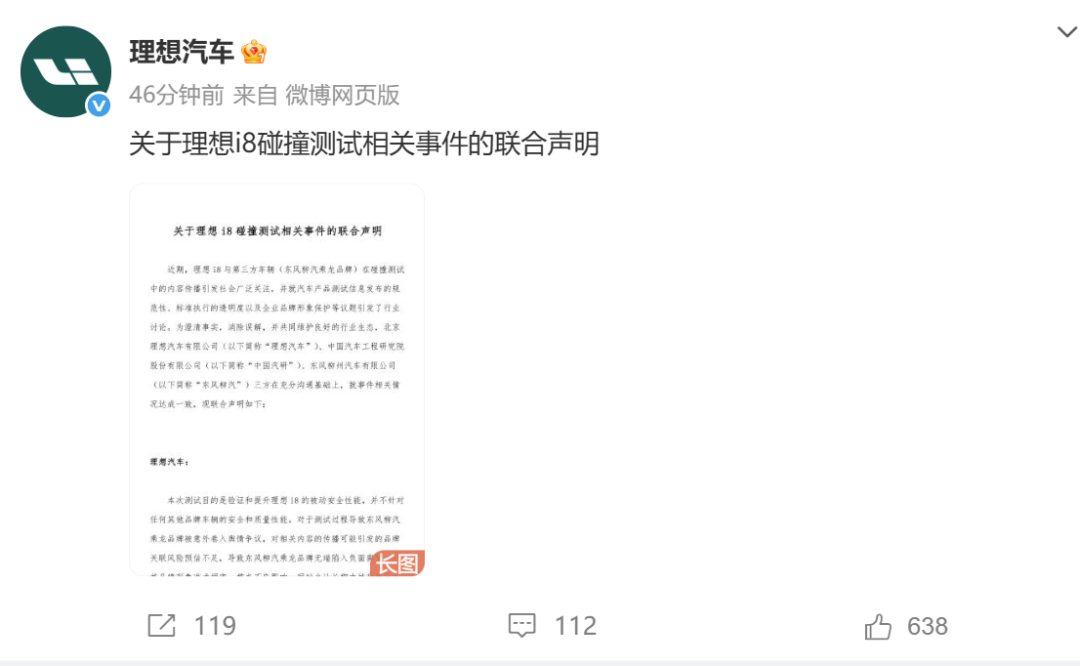 本次测试目的是验证和提升理想i8的被动安全性能,并不针对任何其他品牌车辆的安全和质量性能。对于测试过程导致东风柳汽乘龙品牌被意外卷入舆情争议,对相关内容的传播可能引发的品牌关联风险预估不足,导致东风柳汽乘龙品牌无端陷入负面舆情,对其品牌形象造成损害,带来不良影响,同时也让长期支持和使用东风柳汽产品的卡友和相关公众造成了误解,理想汽车在此表示诚挚的歉意。理想汽车无意冒犯,也从未刻意想通过此次测试质疑或影射东风柳汽的车辆产品质量与安全性。理想汽车将进一步采取措施,避免再次引发类似争议。