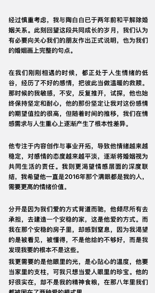 “好运鹿角”发布的长文中,称“陶白白”专注于内容创作与事业开拓,导致他情绪越来越稳定,对感情的态度越来越平淡,逐渐将婚姻视为共同生活的责任。
