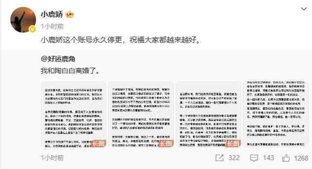 @好运鹿角 在长图中提到两人已于两年前和平解除婚姻关系,“我们认为有必要向关心我们的朋友做出正式说明,也为我们的婚姻画上完整的句点”。