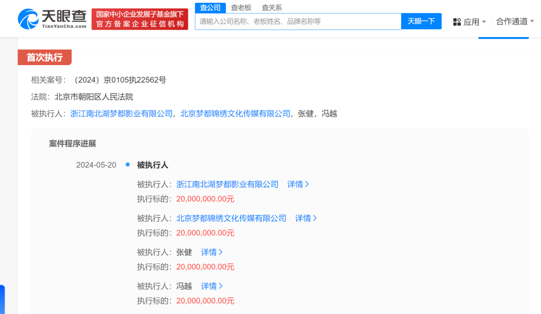 天眼查App显示,近日,浙江南北湖梦都影业有限公司、北京梦都锦绣文化传媒有限公司、张健(演员张若昀父亲)、冯越新增一则被执行人信息,执行标的2000万元,执行法院为北京市朝阳区人民法院。历史股东信息显示,张若昀父亲张健曾为浙江南北湖梦都影业有限公司股东,2015年其所持股份转给张若昀,2017年张若昀退出股东行列。此后,张若昀还曾因确认合同无效纠纷起诉该公司。
