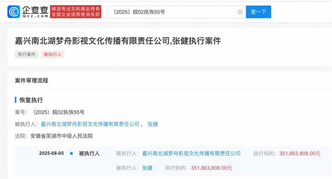 据企查查APP显示,近日,张健及嘉兴南北湖梦舟影视文化传播有限责任公司新增一则恢复执行信息,执行标的3.51亿余元,执行法院为安徽省芜湖市中级人民法院。