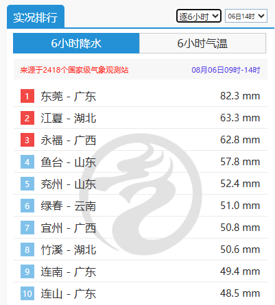 广东部分地方雨势还十分猛烈。截至6日14时,国家气象站中,广东东莞6小时降雨量达82.3毫米,位列全国第一。