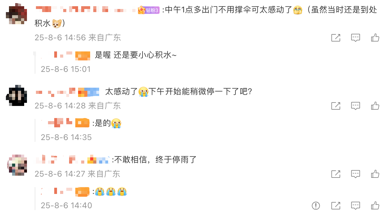 有网友表示:中午1点多出门不用撑伞可太感动了;不敢相信,终于停雨了。