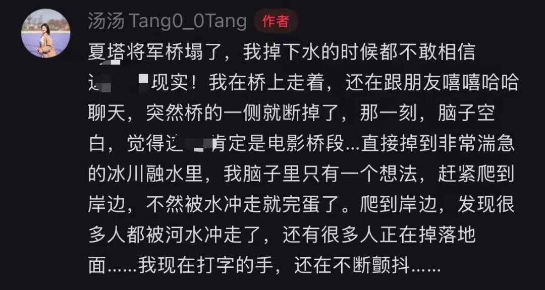 有网友表示,自己从桥上摔下,“我在桥上走着,还在跟朋友嘻嘻哈哈聊天,突然桥的一侧绳索就断掉了,那一刻,脑子空白......爬到岸边,发现很多人都被河水冲走了,还有很多人正在掉落地面,我现在打字的手,还在不断颤抖”。