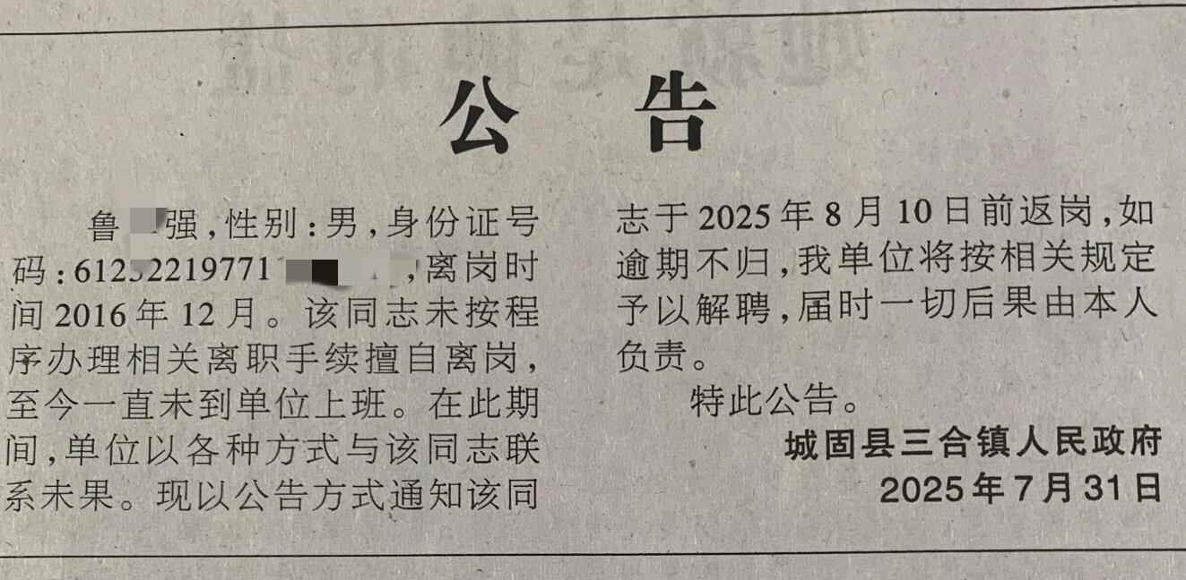 8月1日,陕西汉中城固县三合镇政府登报称,干部鲁某强8年多前擅自离岗至今未上班,通知其限期返岗,逾期不归则解聘。8月4日,极目新闻记者从三合镇政府、城固县人社局获悉,公告属实,鲁某强系事业编制人员,疑失联多年,其离岗后工资已停发。