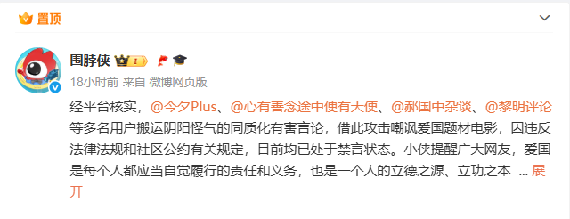 8月4日,微博社区观察员官方账号@围脖侠 发文称处置了多个攻击爱国题材电影的平台账号: