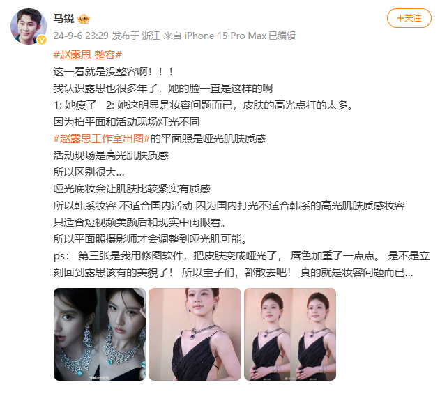 对此,有造型师发声称赵露思没整容,只是因为瘦了再加上妆容问题。