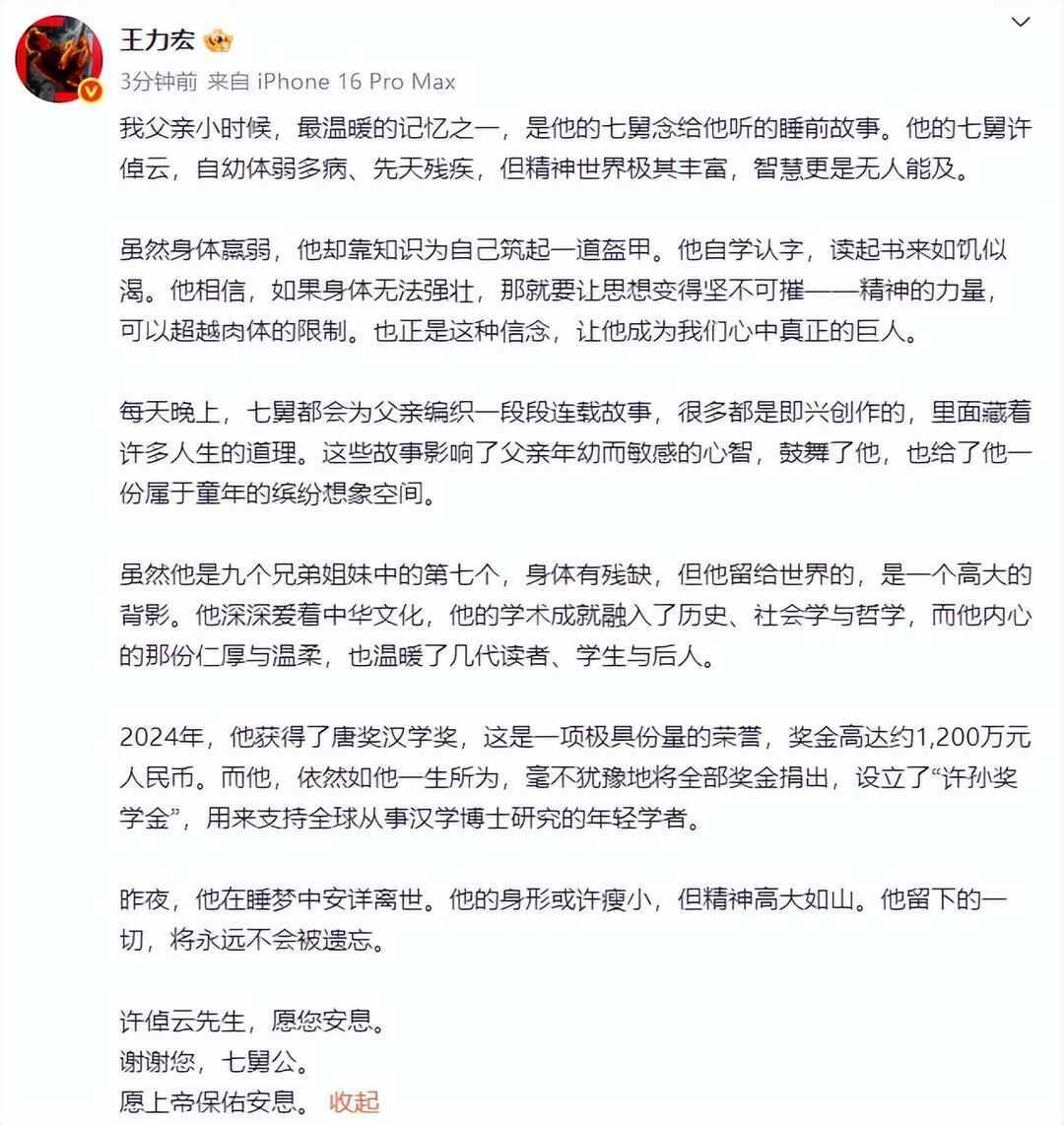 8月5日,王力宏发长文哀悼七舅公许倬云: