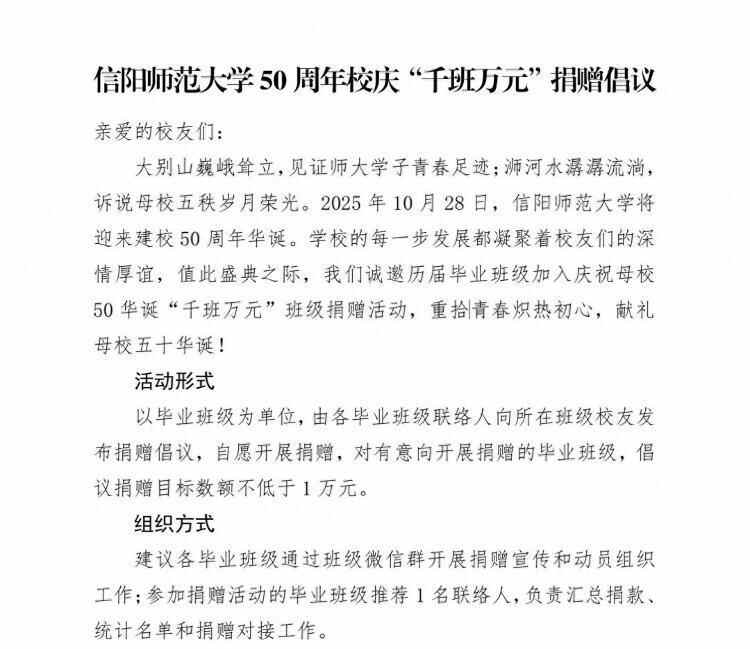 近日,信阳师范大学针对往年毕业生发起50周年校庆“千班万元”捐赠倡议。