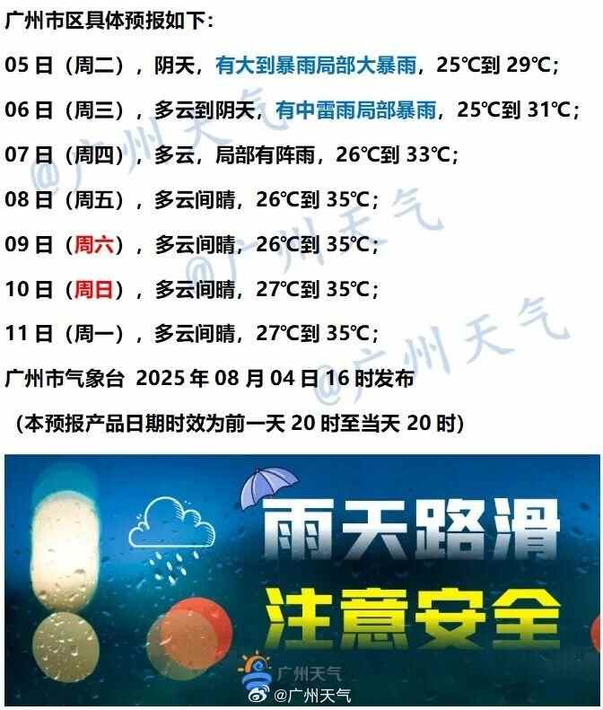 广州市区预报:8月5日,阴天,有大到暴雨局部大暴雨,气温介于25到29℃之间,相对湿度介于75%~98%之间,吹轻微的偏南风;8月6日,多云到阴天,有中雷雨局部暴雨,气温介于25到31℃之间,相对湿度介于75%~98%之间,吹轻微的偏南风;8月7日,多云有雷阵雨,气温介于27到33℃之间,吹轻微的偏南风。