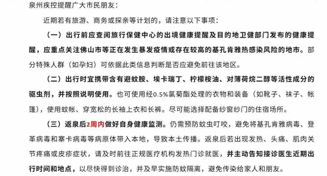 人民日报健康客户端记者发现,福建省福州与泉州两地分别在7月29日与31日发布健康提示,提醒返榕、返泉人员进行14天自我健康监测,其间若出现发热、关节痛、皮疹等疑似症状,请立即就医并告知旅居史。