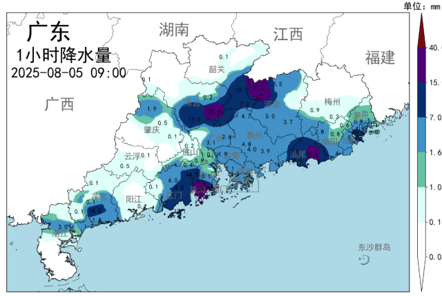 其中,在5日8时到9时,1小时降雨量较大区域在汕尾、珠海、江门,以及清远、韶关的南部。