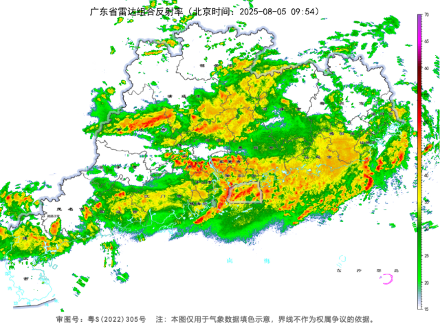 截至5日9时54分,广东仍有较大范围降雨,从天气雷达回波图看,降雨主要集中在广东南部沿海,以及粤北南部。