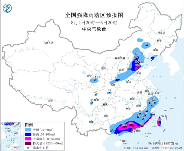 中央气象台8月4日18时继续发布暴雨橙色预警:预计8月4日20时至5日20时,福建、江西南部、湖南南部、广西中东部、广东、香港、澳门、台湾岛等地部分地区有大到暴雨。其中,广东中部和东南部沿海等地局地还有特大暴雨。