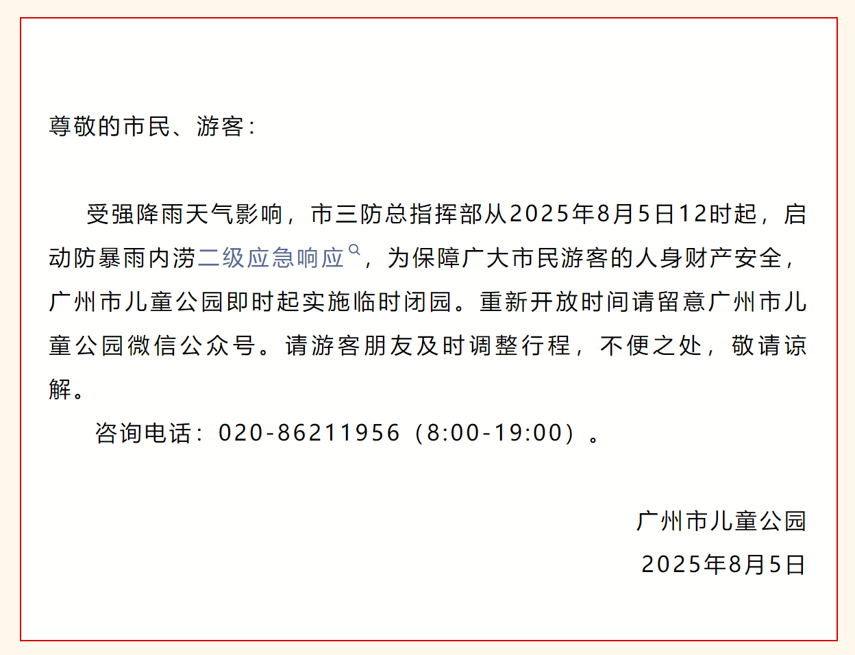 受强降雨天气影响,市三防总指挥部从2025年8月5日12时起,启动防暴雨内涝二级应急响应,为保障广大市民游客的人身财产安全,广州市儿童公园实施临时闭园。重新开放时间请留意广州市儿童公园微信公众号。