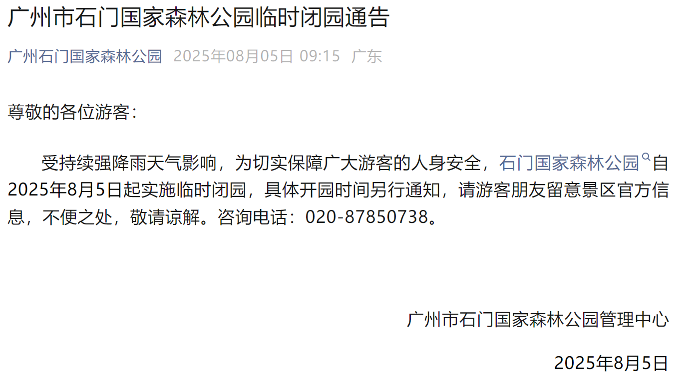 受持续强降雨天气影响,为切实保障广大游客的人身安全,石门国家森林公园自2025年8月5日起实施临时闭园,具体开园时间另行通知,请游客朋友留意景区官方信息。咨询电话:020-87850738。