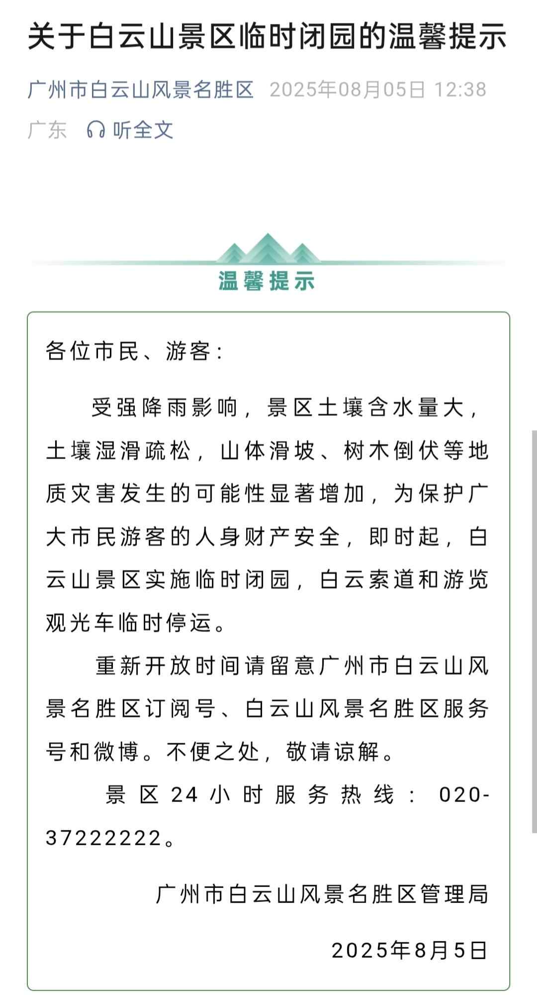 记者从广州市白云区风景名胜区公众号获悉,受强降雨影响,景区土壤含水量大,土壤湿滑疏松,山体滑坡、树木倒伏等地质灾害发生的可能性显著增加,为保护广大市民游客的人身财产安全,白云山景区实施临时闭园,白云索道和游览观光车临时停运。重新开放时间市民游客可留意广州市白云山风景名胜区订阅号、白云山风景名胜区服务号和微博。