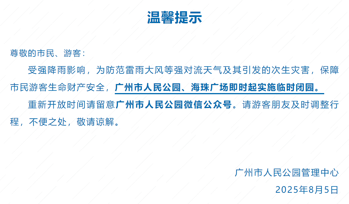 受强降雨影响,为防范雷雨大风等强对流天气及其引发的次生灾害,保障市民游客生命财产安全,广州市人民公园、海珠广场实施临时闭园。重新开放时间市民游客可留意广州市人民公园微信公众号,请游客朋友及时调整行程。