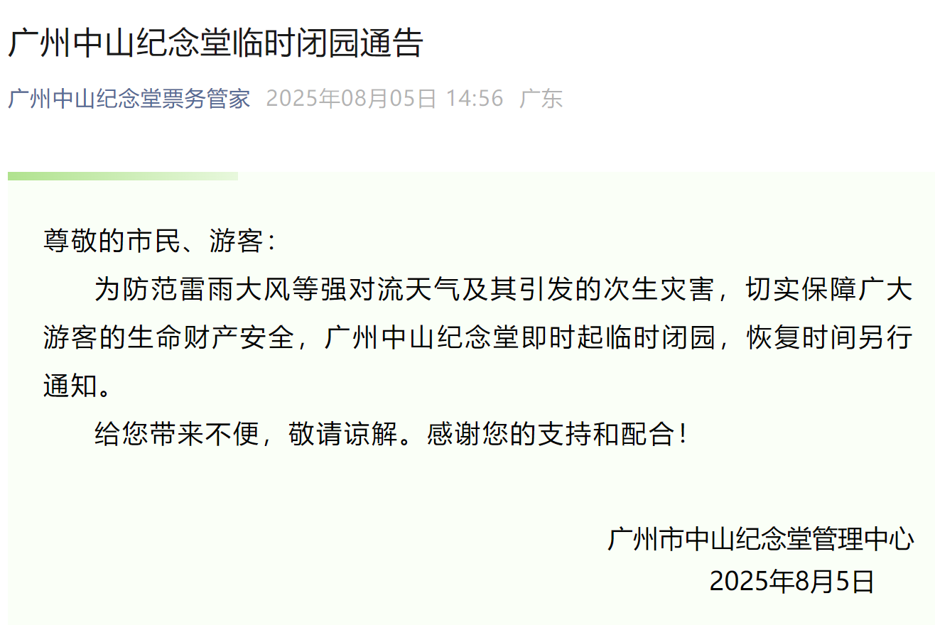 为防范雷雨大风等强对流天气及其引发的次生灾害,切实保障广大游客的生命财产安全,广州中山纪念堂临时闭园,恢复时间另行通知。
