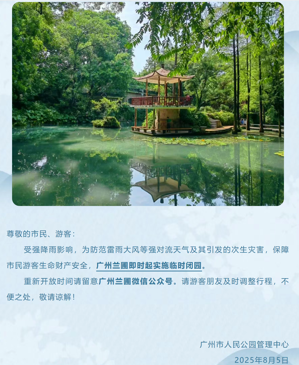 受强降雨影响,为防范雷雨大风等强对流天气及其引发的次生灾害,保障市民游客生命财产安全,广州兰圃实施临时闭园。重新开放时间请留意广州兰圃微信公众号,请游客朋友及时调整行程。
