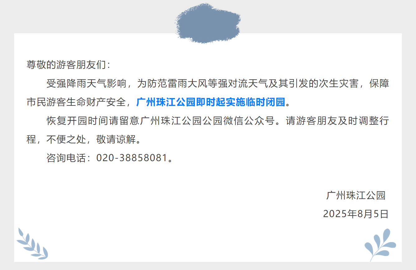 受强降雨天气影响,市三防总指挥部从2025年8月5日12时起,启动防暴雨内涝二级应急响应,为保障广大市民游客的人身财产安全,广州市儿童公园实施临时闭园。重新开放时间请留意广州市儿童公园微信公众号。