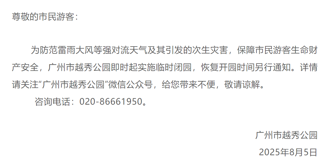 为防范雷雨大风等强对流天气及其引发的次生灾害,保障市民游客生命财产安全,广州市越秀公园实施临时闭园,恢复开园时间另行通知。详情请关注“广州市越秀公园”微信公众号。