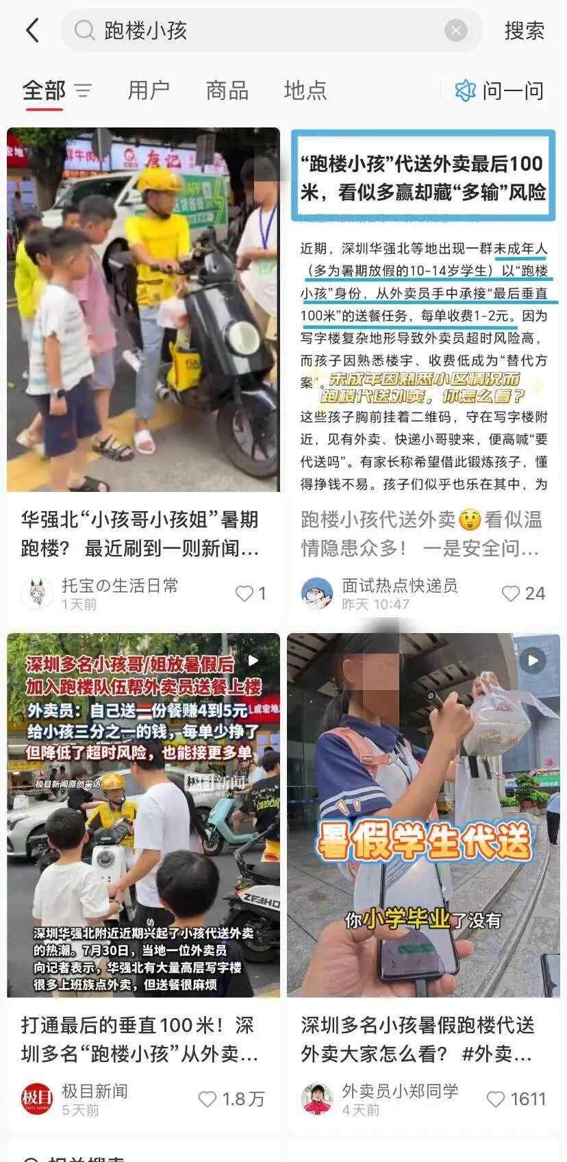 通知源于近日,华强北“跑楼小孩”现象在网上热转。这些正值暑期放假的孩子,从外卖员手中承接“最后垂直100米”的送餐任务,每单收费一两元。他们聚集在街边的外卖小哥身旁“接单”,迅速引发了社会关注。有些网友表示,比起躲在家里吹空调、玩手机,“跑楼小孩”通过自己的劳动得到报酬,增强了劳动意识的同时,也增长社会交往的本领。但也有很多人对“跑楼小孩”的人身安全、配餐质量表示担忧。