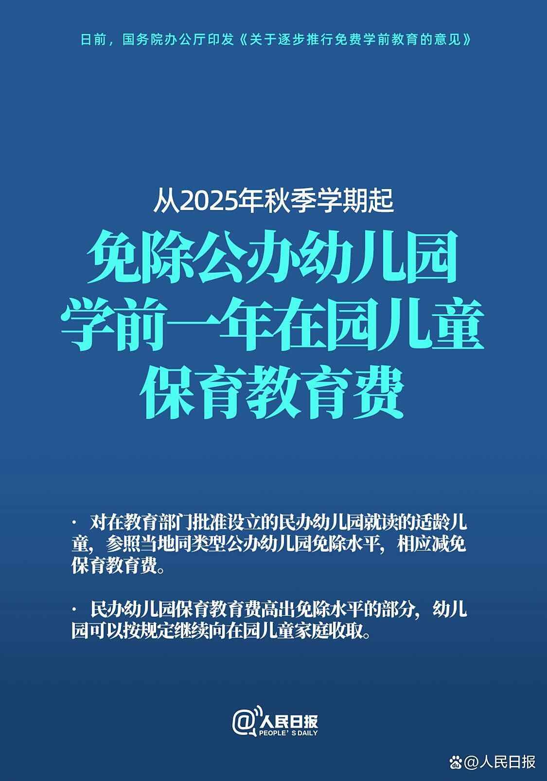 日前,国务院办公厅印发《关于逐步推行免费学前教育的意见》,推进学前教育普及普惠安全优质发展。《意见》明确,从2025年秋季学期起,免除公办幼儿园学前一年在园儿童保育教育费。