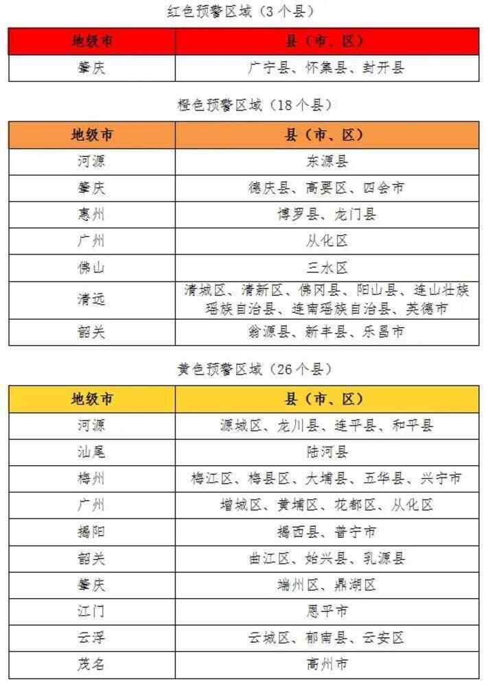 河源东源县,肇庆德庆县、高要区、四会市,惠州博罗县、龙门县,广州从化区,佛山三水区,清远清城区、清新区、佛冈县、阳山县、连山壮族瑶族自治县、连南瑶族自治县、英德市,韶关翁源县、新丰县、乐昌市,局地发生山洪灾害可能性大(橙色预警)。
