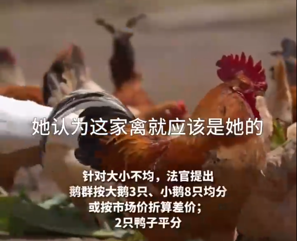 这起案件中,双方争议的焦点不是房产存款,而是共同饲养的53只家禽:29只鸡、22只鹅和2只鸭子。