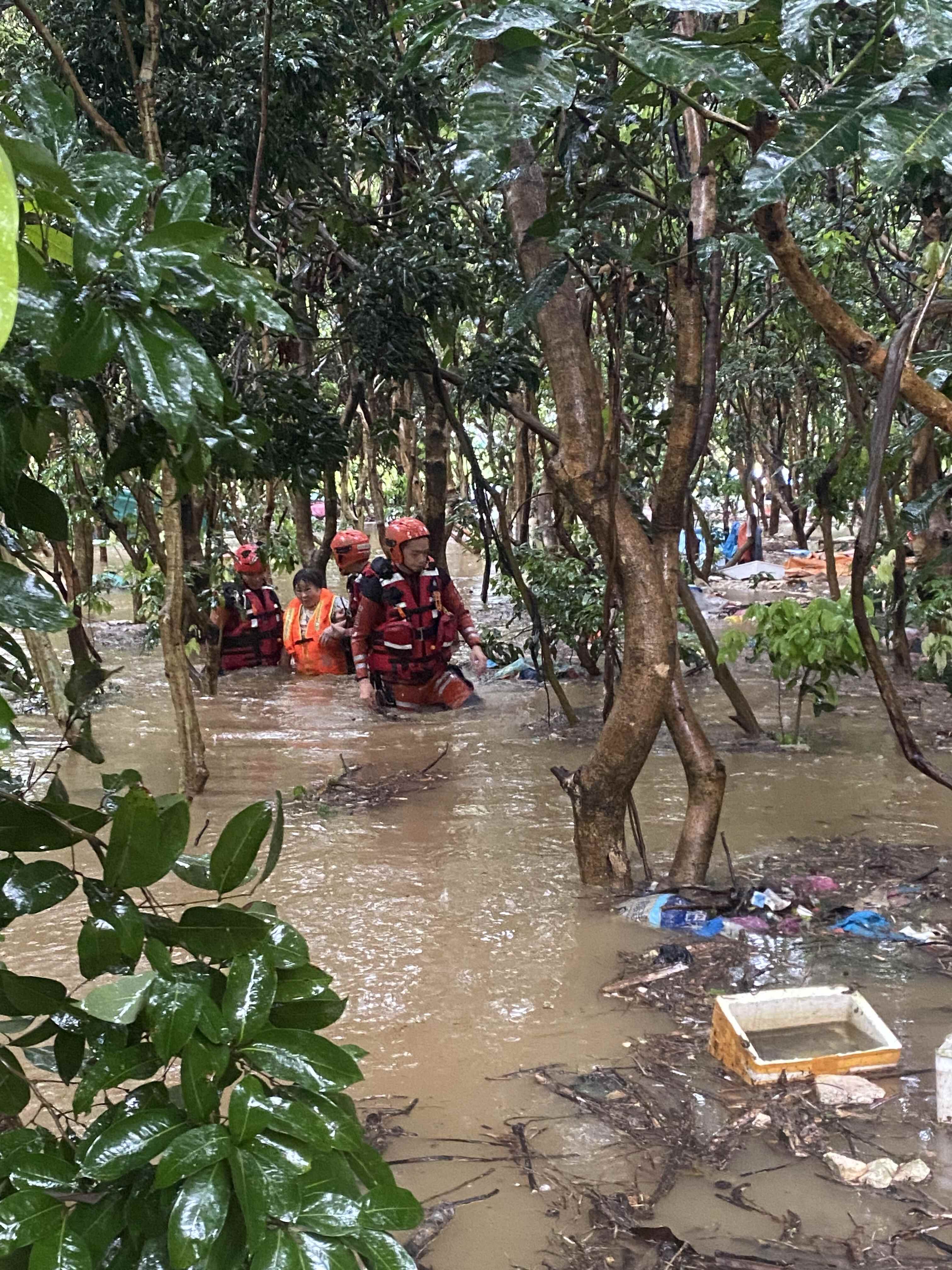 8月4日,惠州惠东县环城南路欧洲城后方赛场山突发水浸险情,一名七旬老人因水位暴涨被困树林间的小菜园,情急之下攀爬至树顶避险。消防员到达现场后发现,菜园周围树木茂密,冲锋艇无法进入,消防员迅速穿戴救生衣和防割手套,在齐膝深的积水中艰难跋涉,用砍刀清理缠绕的藤蔓开辟路径。