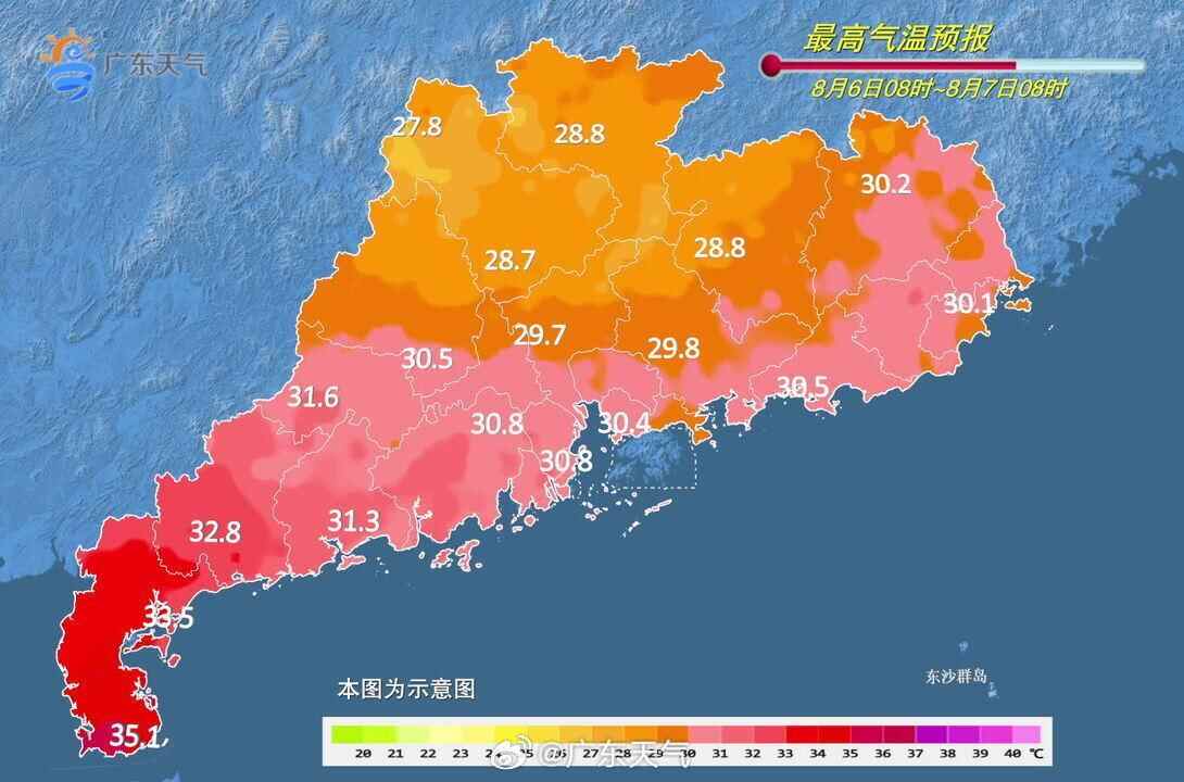 8日,大部市县多云间晴天,午后局部有(雷)阵雨。广东最高气温将普遍介于33~36℃。