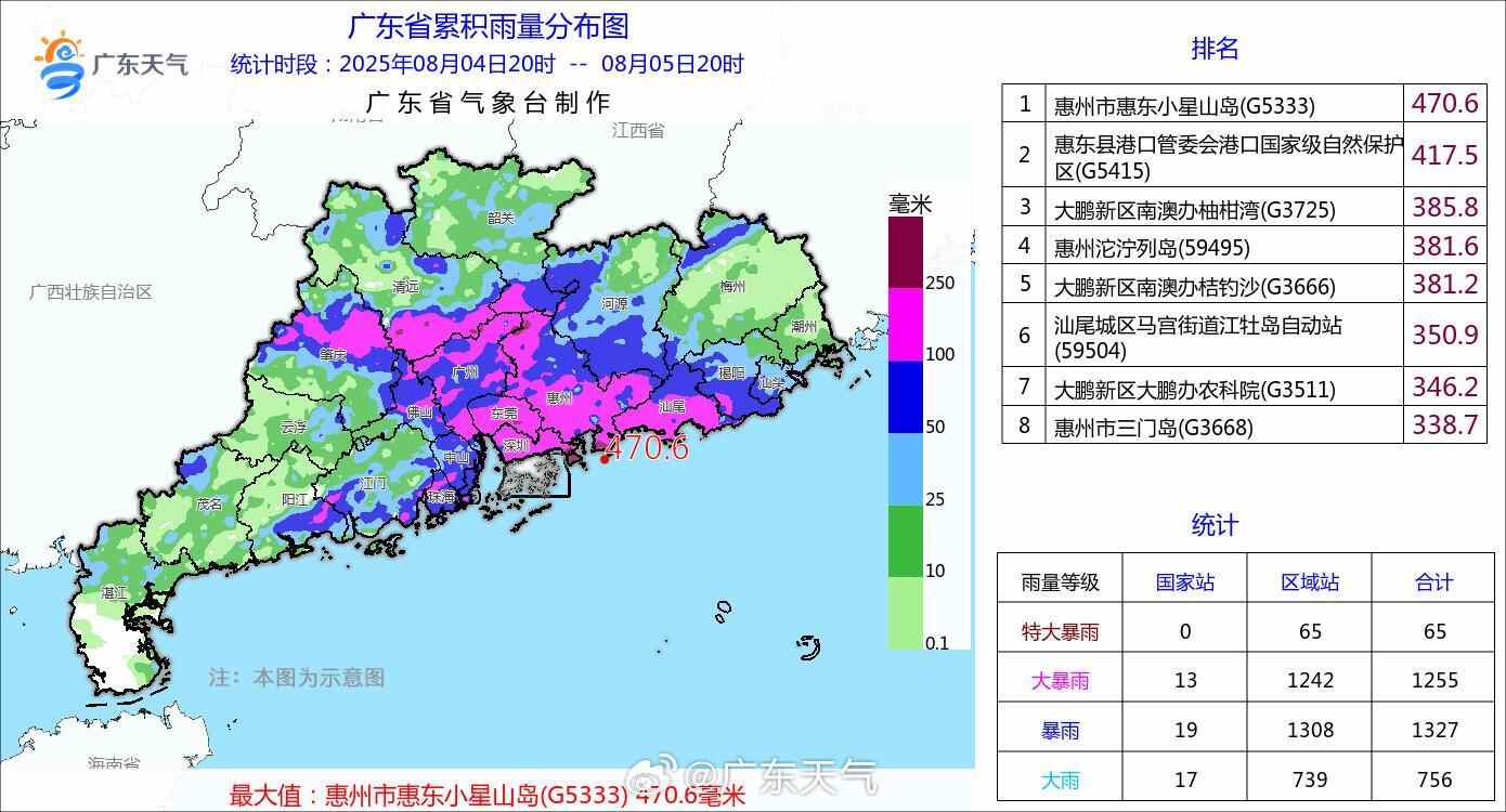 据气象监测,8月4日20时到8月5日20时,广东全省平均雨量63.7毫米,超过25毫米镇街占全省总镇街数的65.2%,有28个镇街录得超过250毫米的特大暴雨,有414个镇街录得100毫米~250毫米的大暴雨,有338个镇街录得50毫米~100毫米的暴雨,有278个镇街录得25毫米~50毫米的大雨。