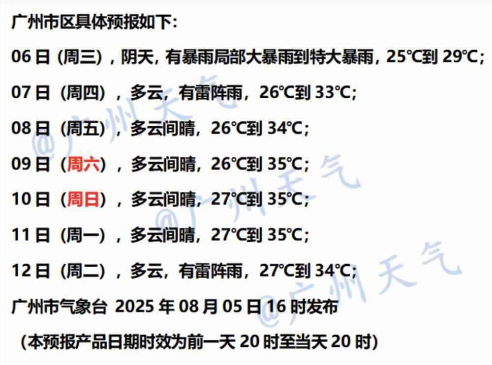 广州市气象台8月5日傍晚预计,广州6日继续受季风低槽影响,仍有暴雨局部大暴雨到特大暴雨。预计7日起广州转雷阵雨天气,雨势减弱气温回升。展望8月9日至11日,广州市区的最高气温可达35℃。