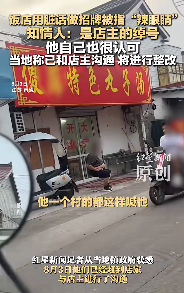 记者从当地镇政府获悉,8月3日,他们已经赶到店家与店主进行了沟通。由于店主很认可自己的绰号,所以将该绰号作为了门店招牌。目前他已经认识到该绰号不雅,将尽快做出整改,更换门店招牌。