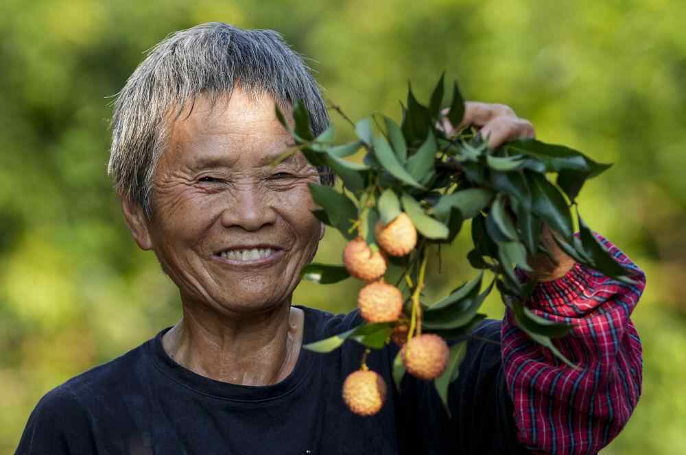 7月29日,重庆市涪陵区南沱镇睦和村村民在荔枝园内采摘新鲜的荔枝。