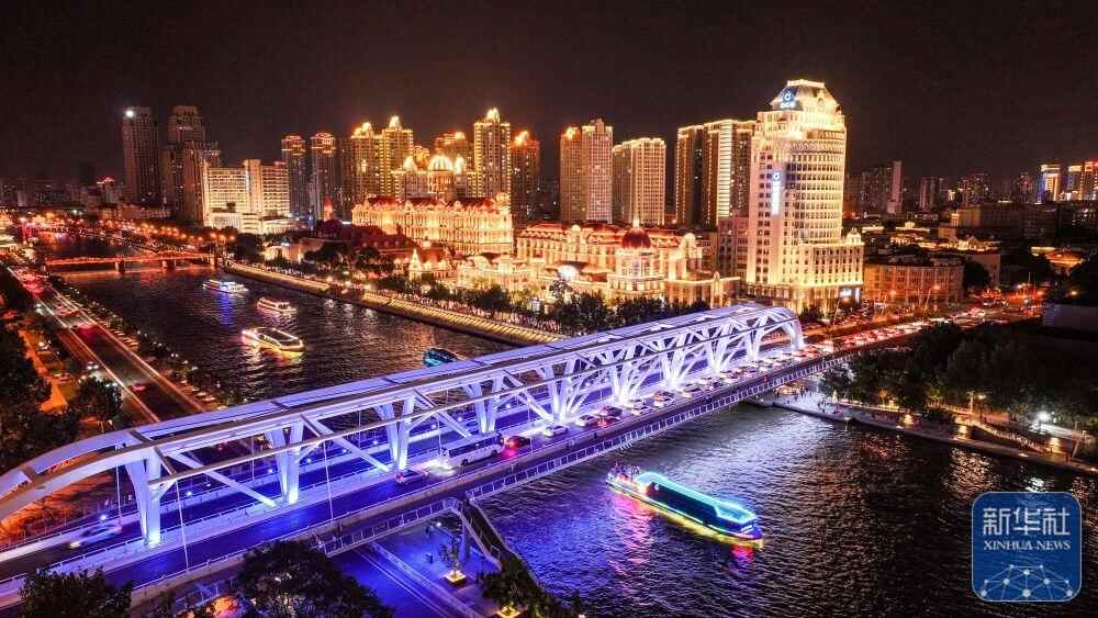 华灯初上,海河两岸的夜景灯光渐次点亮。现代高楼流光溢彩,海河游船穿梭不息,桥梁灯带映射水面形成五彩斑斓的倒影,共同绘就津城靓丽的夜色风景线。