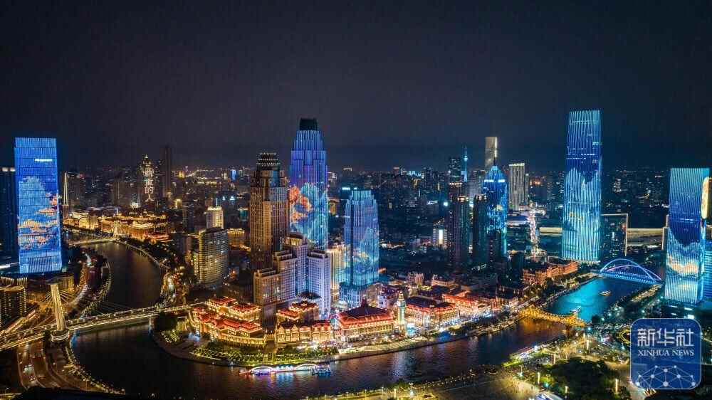 ↑ 这是8月1日拍摄的天津津湾广场沿岸海河夜景和楼体灯光(无人机照片)。