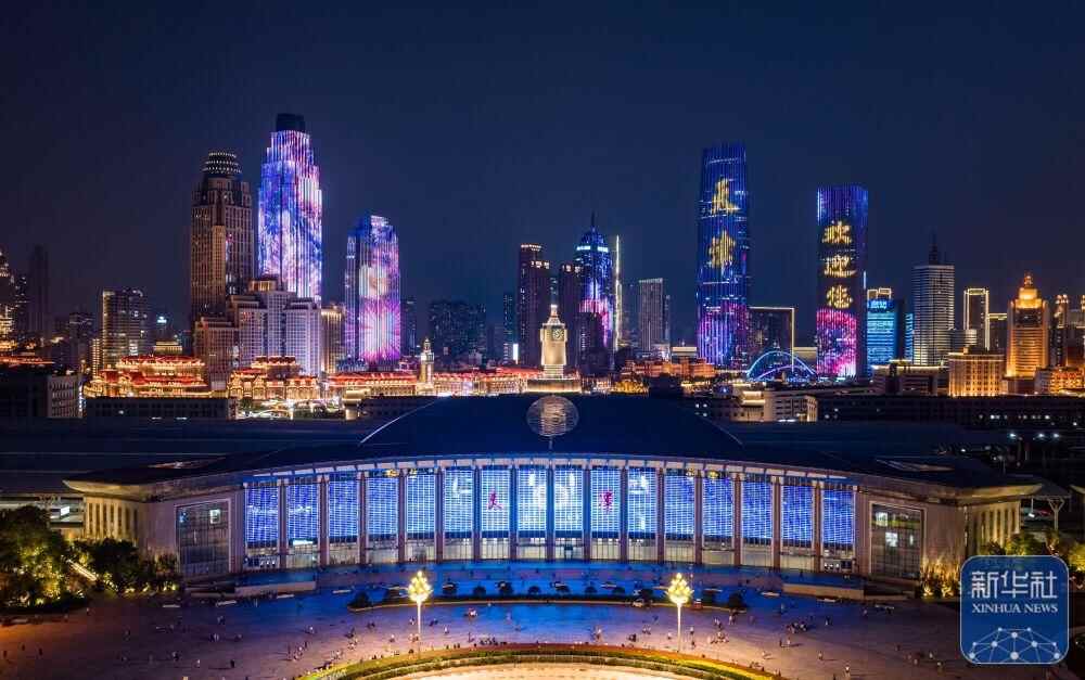 ↑ 这是8月1日在天津站后广场拍摄的海河沿岸楼体灯光(无人机照片)。