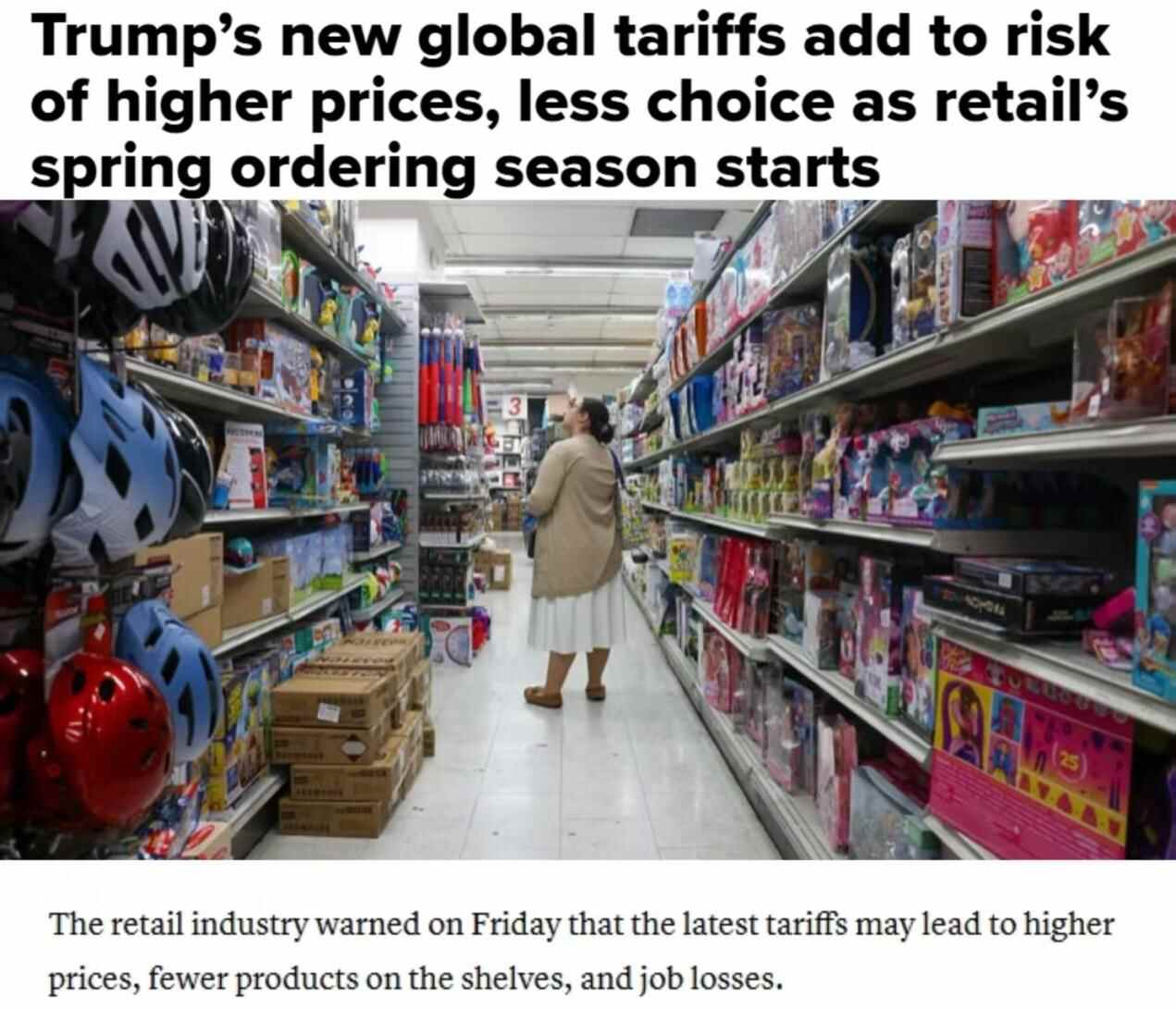 与此同时,美国政府的关税政策反而使零售业加速裁员。报告显示,截至7月,零售商宣布削减超8万个岗位,同比激增近250%。报告还警告称,最新关税政策可能导致物价上涨、货架商品减少以及就业岗位流失。