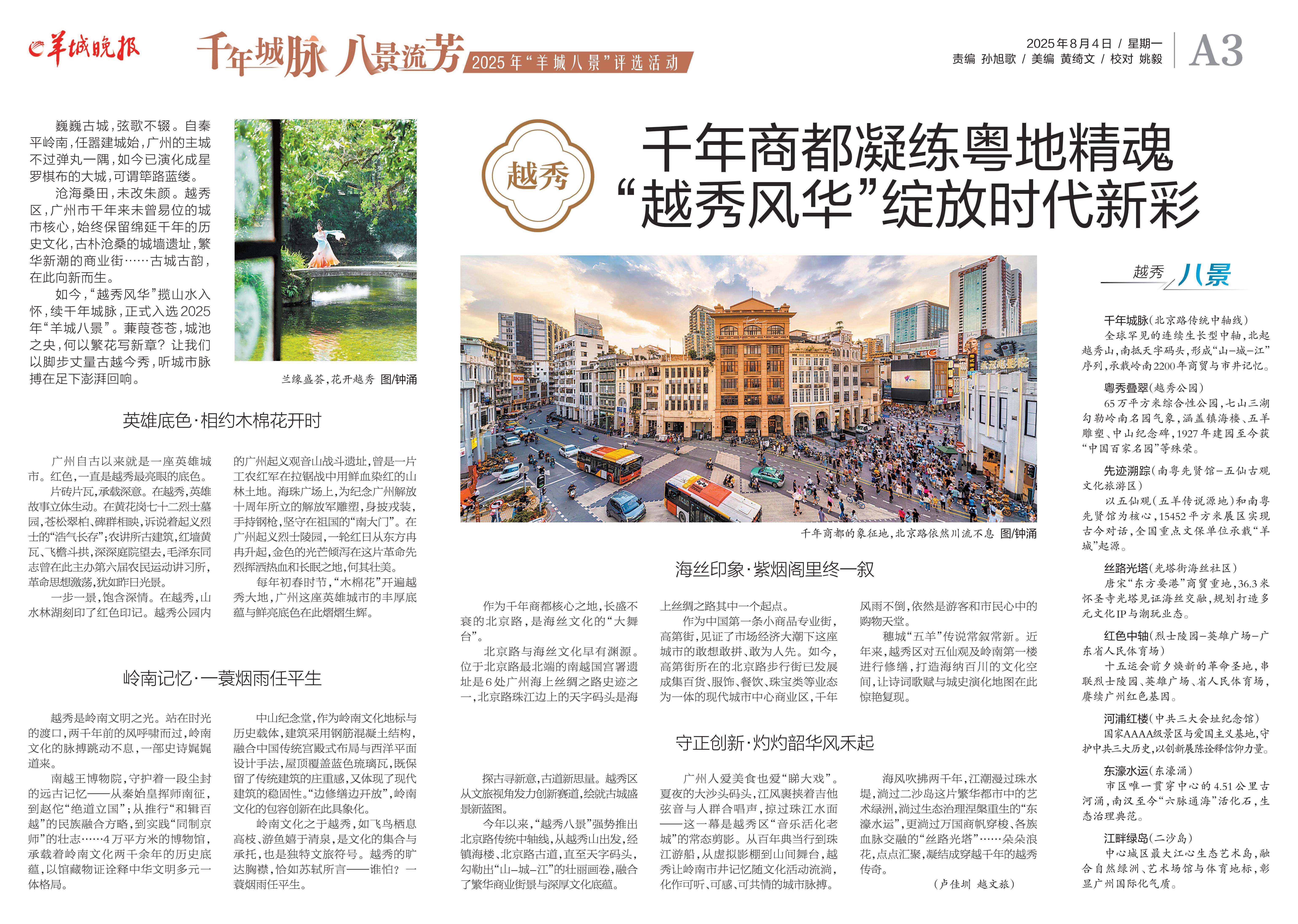 今年以来,“越秀八景”强势推出北京路传统中轴线,从越秀山出发,经镇海楼、北京路古道,直至天字码头,勾勒出“山-城-江”的壮丽画卷,融合了繁华商业街景与深厚文化底蕴。