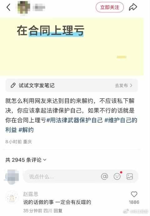 记者注意到,8月3日,有网友就赵露思与银河酷娱之间的纠纷在社交平台发帖称:“就怎么利用网友来达到目的来解约,不应该私下解决,你应该拿起法律保护自己,如果不行的话就是你在合同上理亏。”