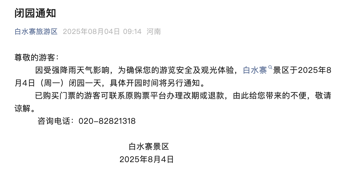 因受强降雨天气影响,为确保游客的游览安全及观光体验,白水寨景区于2025年8月4日(周一)闭园一天,具体开园时间将另行通知。