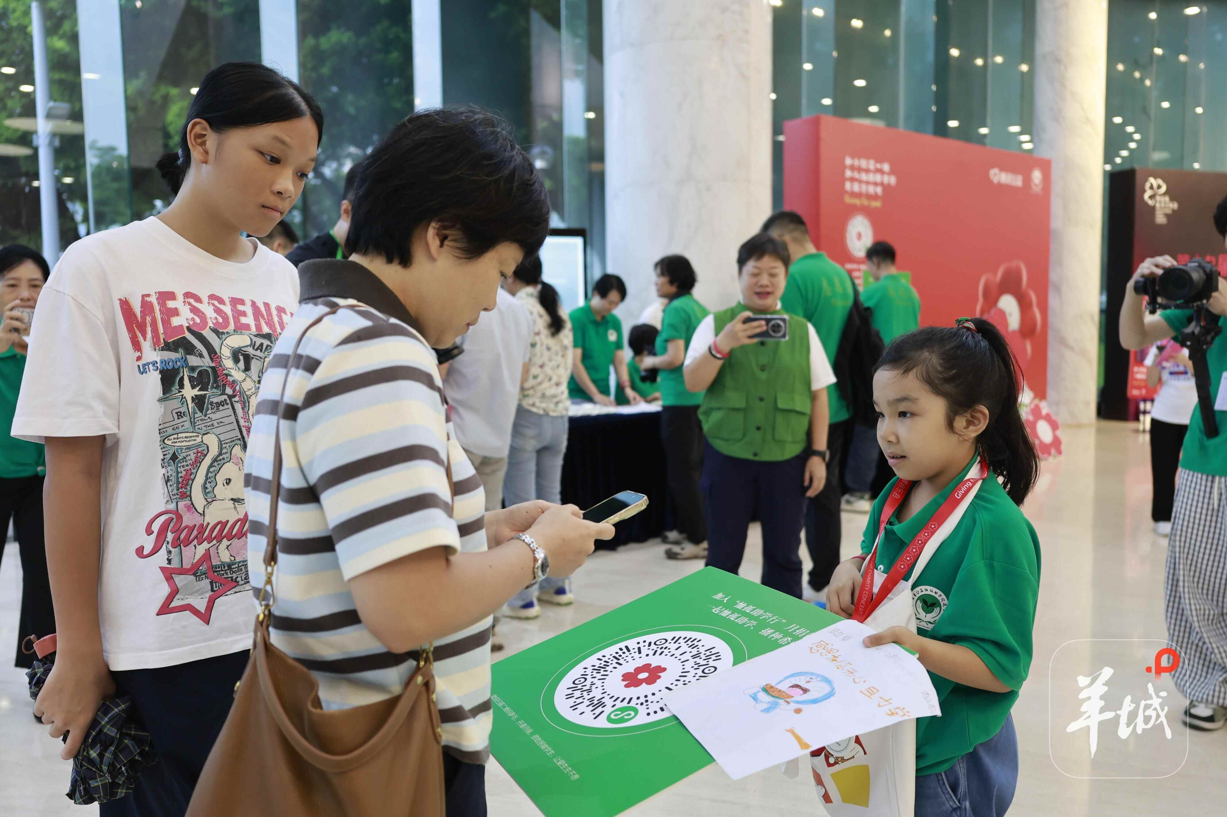 在音乐会开场前,不少穿着绿色志愿者服的小朋友们走到哥哥姐姐、叔叔阿姨的身边,向大人们介绍着恤孤助学会的助学项目。为了继续筹集善款,现场设置了咨询摊位,大小志愿者们化身爱心劝募官,在音乐厅的各处邀约爱心人士捐赠支持。