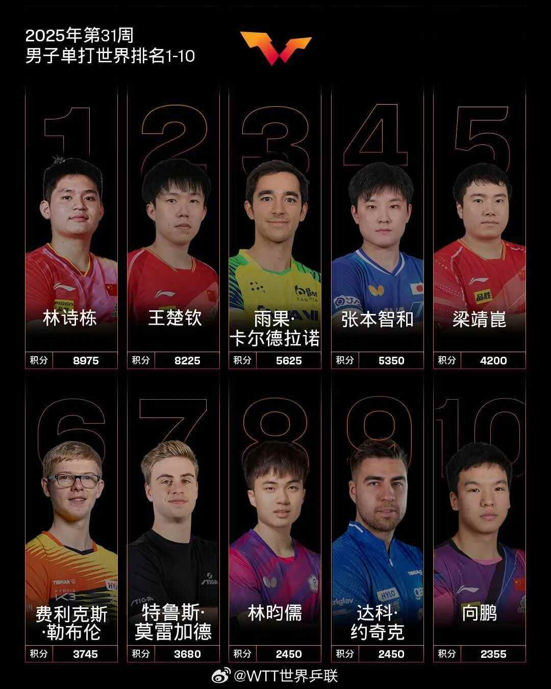 在最新公布的国际乒联2025年第31周世界排名中,张本智和位列男子单打第4名。
