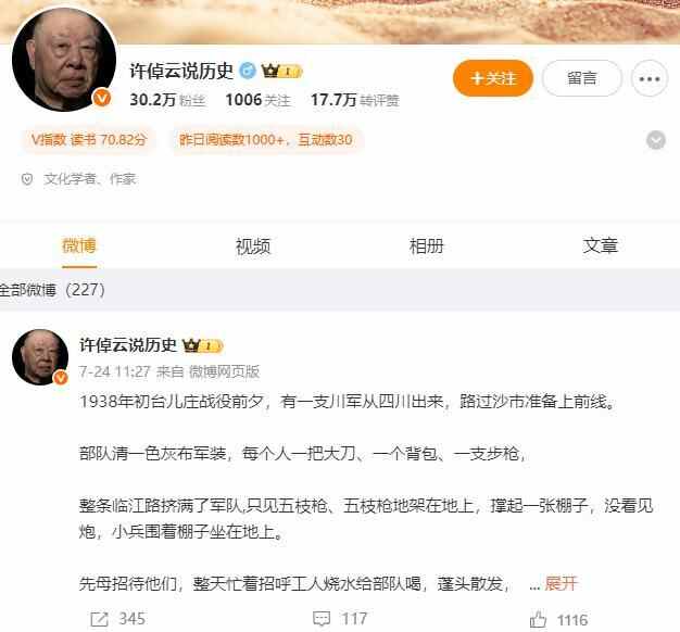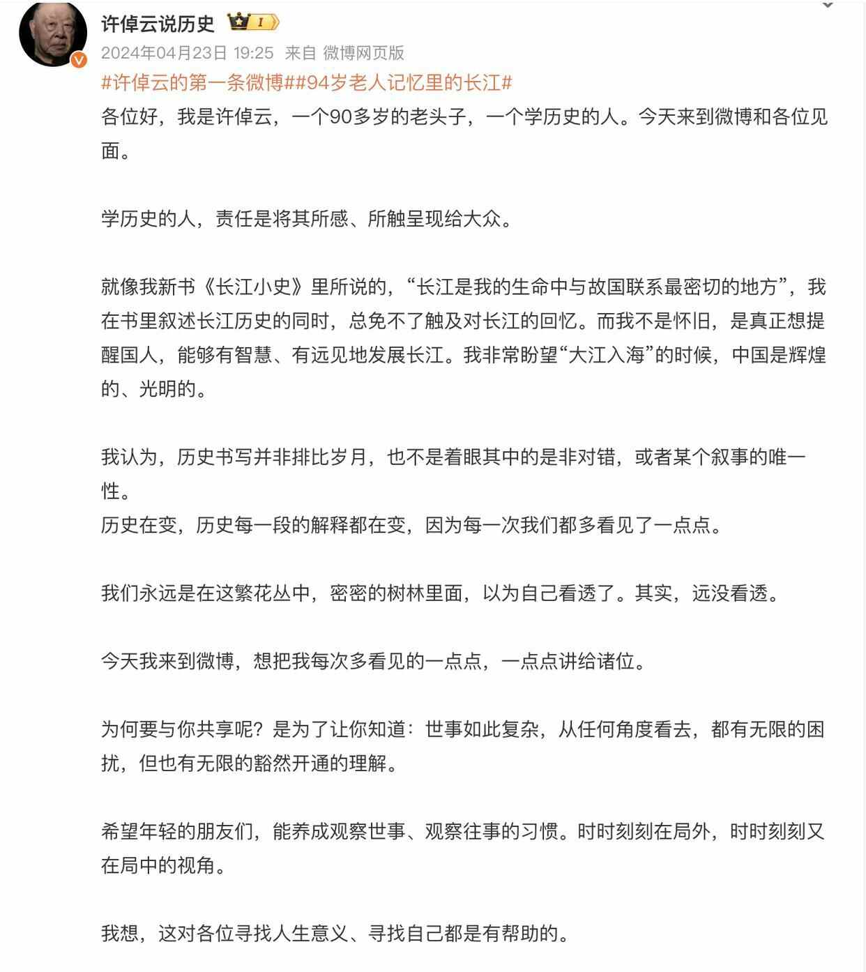 2024年4月23日,他入驻微博并发布首条推文,指出学历史的人,责任是将其所感、所触呈现给大众,希望年轻的朋友,能养成观察世事、观察往事的习惯,时时刻刻在局外,时时刻刻又在局中的视角。欢迎大家与他交流探讨历史、人生问题。