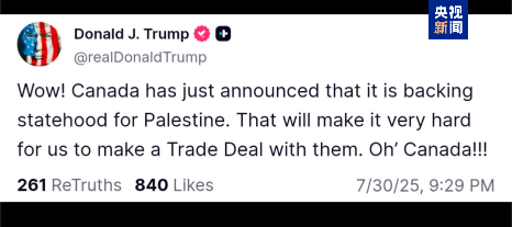 加拿大总理卡尼7月30日表示,加拿大打算在2025年9月举行的第80届联合国大会上承认巴勒斯坦国。卡尼讲话刚结束,特朗普立刻在社交媒体上回应称:“加拿大宣布支持巴勒斯坦建国。这将使我们很难与他们达成贸易协议。”此后不到24个小时内,他就签署了对加拿大加征关税的行政令。