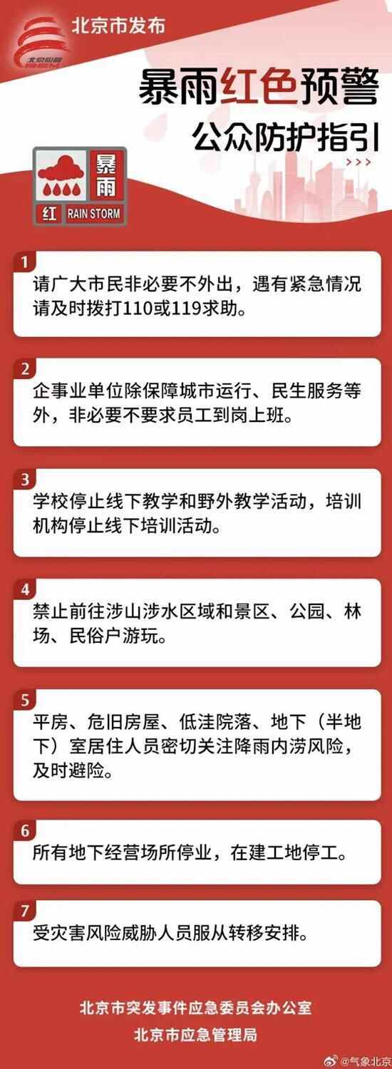 北京市气象台2025年08月04日13时00分发布暴雨红色预警信号:预计今日午后开始,北京市将出现强降雨天气,最强降雨集中在4日18时至5日05时,该期间部分地区6小时降雨量可达150毫米以上,个别点200毫米以上,山区及浅山区出现山洪、泥石流、滑坡等灾害的风险极高,低洼地区极易出现积水,请注意防范。