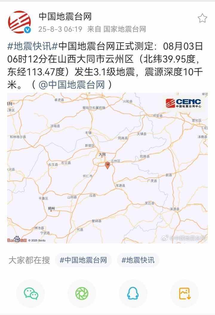据中国地震台网正式测定,8月3日6时12分,在山西大同市云州区发生3.1级地震,震源深度10千米;8月4日9时33分,在山西大同市云州区发生3.3级地震,震源深度8千米。